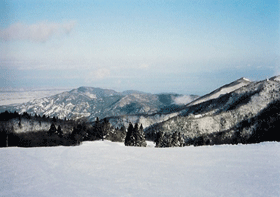 | パノラマコースの頂上、コヤマノ岳から琵琶湖。12月28日の日曜日はリフト待ち 0分。コースには人影が無いときも。 |