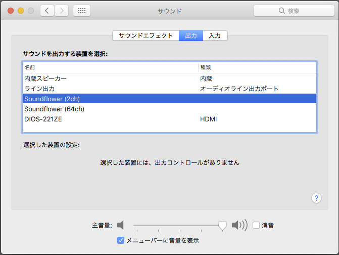 3. システム環境設定 > サウンド > Soundflower(2ch)を選ぶ